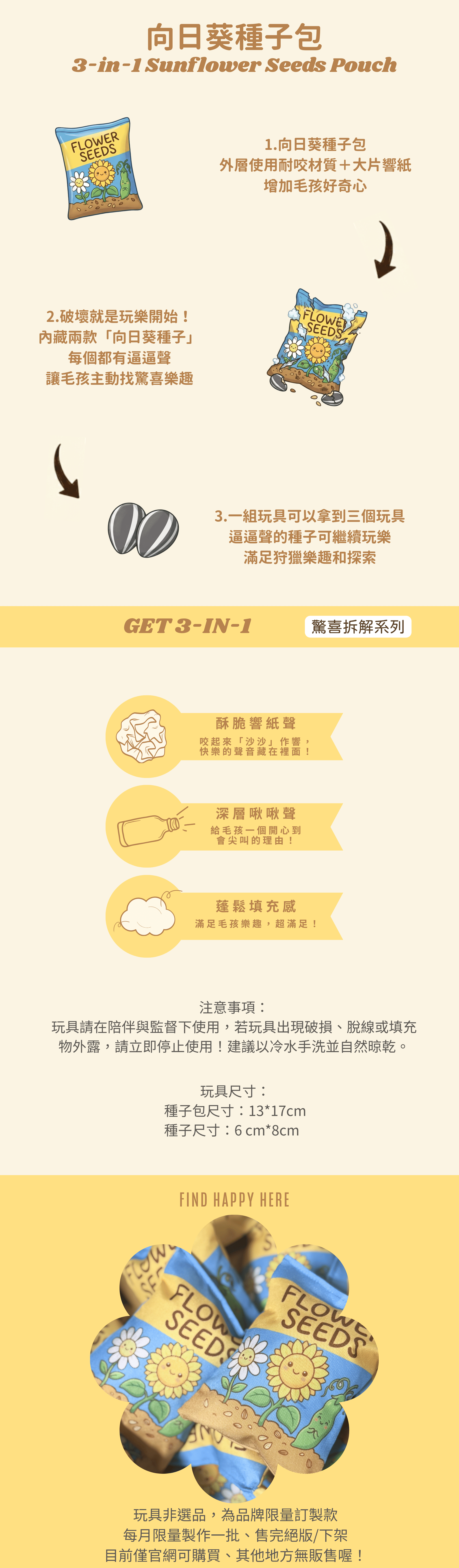 一次擁有三個玩具!外層是充滿響紙聲的耐咬材質,內層藏著兩顆啾啾聲向日葵種子。